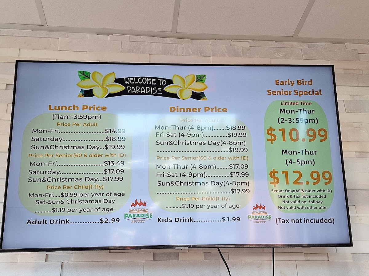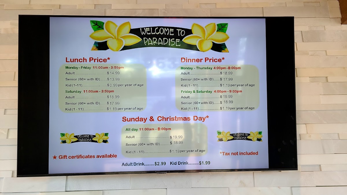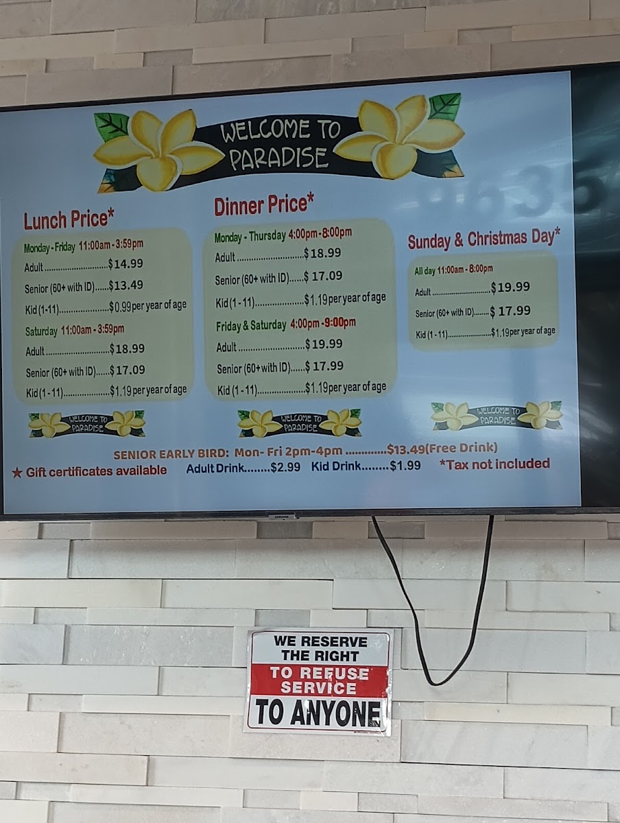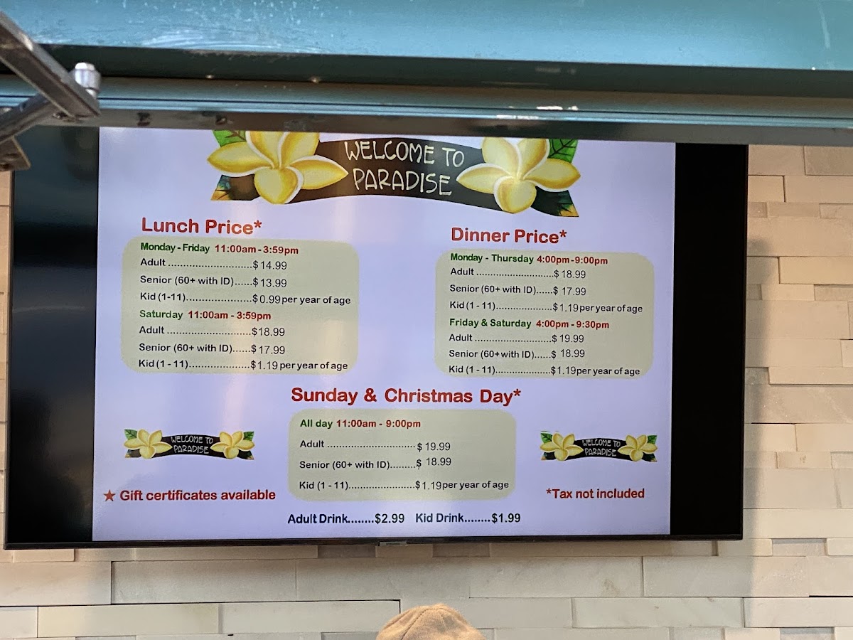 Sharing my experience the 1st time I was here “Paradise Buffet” in the weekend with my friends and family. The place was good , clean, nice The staff were friendly, helpful, clean up every single dish you finished. The last is the food . i was so happy when i found the new spot for me and my family. I went to 4-5 buffets around OC couple years ago and now . Even I tried the new place from my friends recommended it but I didn’t like it because everything look same “Mama huhu” . So, back to the Paradise Buffet I drove by I saw many people got in line crazy I go on google check it out I read all the reviews and see all pictures of food I did tell my friends and family spent time at this buffet in the weekend. I love the cooking section. There is Someone who cook for you the food you want . Other sections is displayed all of sushi dishes and fruits, Salad, vegetables , Jelly, Corn chip , shrimp Achieves, ect... I like how they displayed all fresh sushi dishes and fruits above the iced keep the food fresh . The last section they displayed is dessert. There are many kind of different cake I like such as cheese cake, chocolate mousse, coconut macaron , carrot cake, ... And specifically, I like the coffee is not weak I like strong coffee without sugar so I can taste with my chocolate mousse There is section displayed crab , fried chicken, orange chicken is be best one , roast beef, grilled teriyaki chicken , pizza,.... Let’s try it after reading my review. If you don’t like just give them a review for others like us know . We’re always looking for good food .