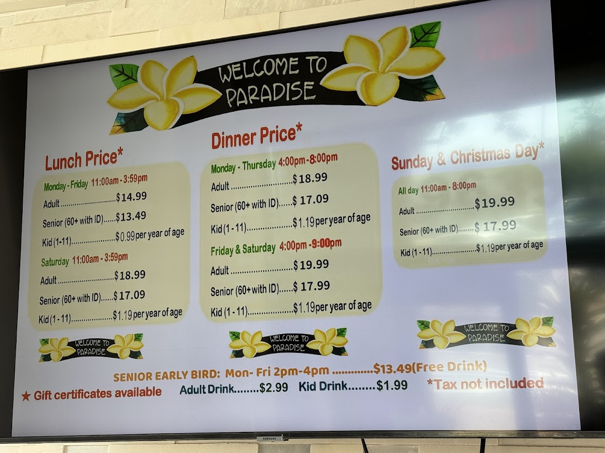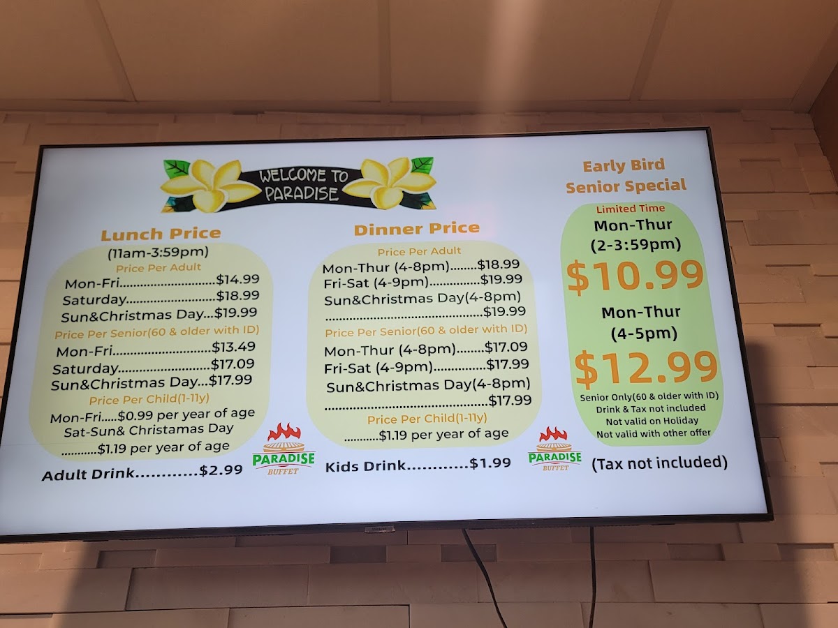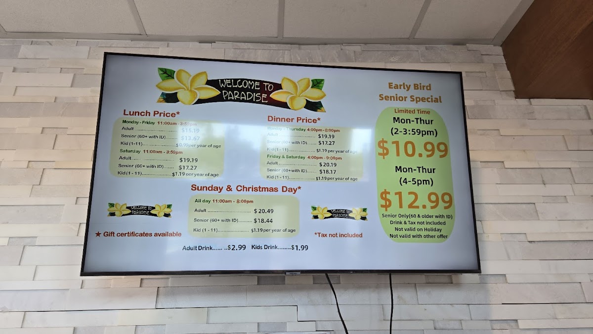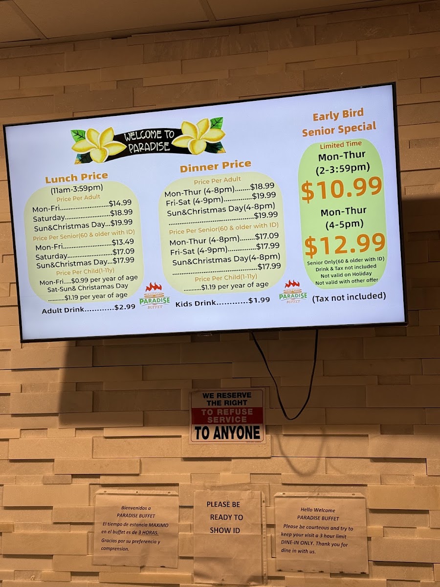 Sharing my experience the 1st time I was here “Paradise Buffet” in the weekend with my friends and family. The place was good , clean, nice The staff were friendly, helpful, clean up every single dish you finished. The last is the food . i was so happy when i found the new spot for me and my family. I went to 4-5 buffets around OC couple years ago and now . Even I tried the new place from my friends recommended it but I didn’t like it because everything look same “Mama huhu” . So, back to the Paradise Buffet I drove by I saw many people got in line crazy I go on google check it out I read all the reviews and see all pictures of food I did tell my friends and family spent time at this buffet in the weekend. I love the cooking section. There is Someone who cook for you the food you want . Other sections is displayed all of sushi dishes and fruits, Salad, vegetables , Jelly, Corn chip , shrimp Achieves, ect... I like how they displayed all fresh sushi dishes and fruits above the iced keep the food fresh . The last section they displayed is dessert. There are many kind of different cake I like such as cheese cake, chocolate mousse, coconut macaron , carrot cake, ... And specifically, I like the coffee is not weak I like strong coffee without sugar so I can taste with my chocolate mousse There is section displayed crab , fried chicken, orange chicken is be best one , roast beef, grilled teriyaki chicken , pizza,.... Let’s try it after reading my review. If you don’t like just give them a review for others like us know . We’re always looking for good food .